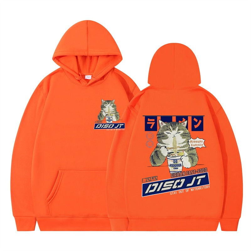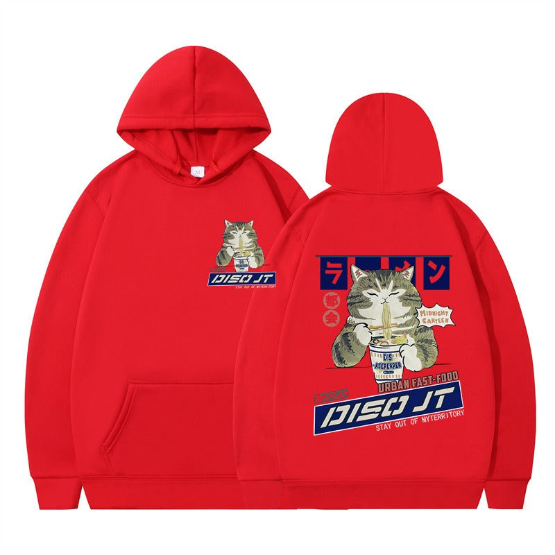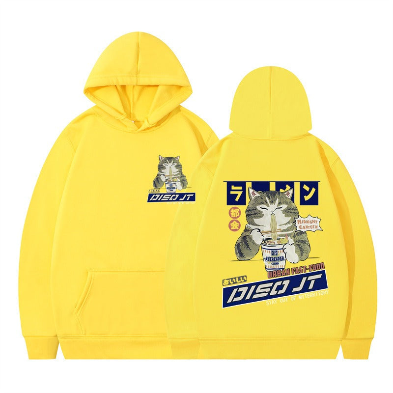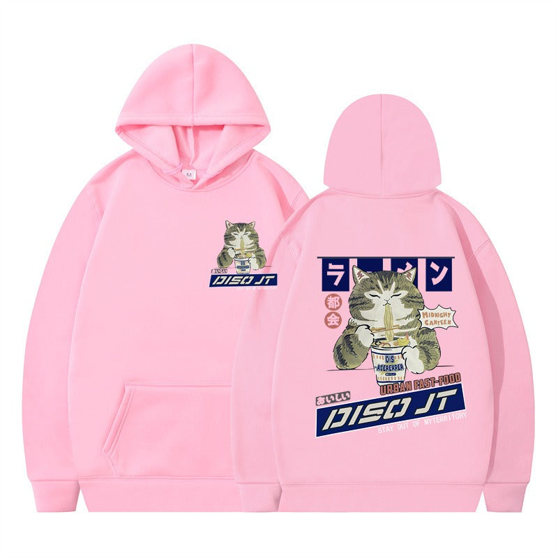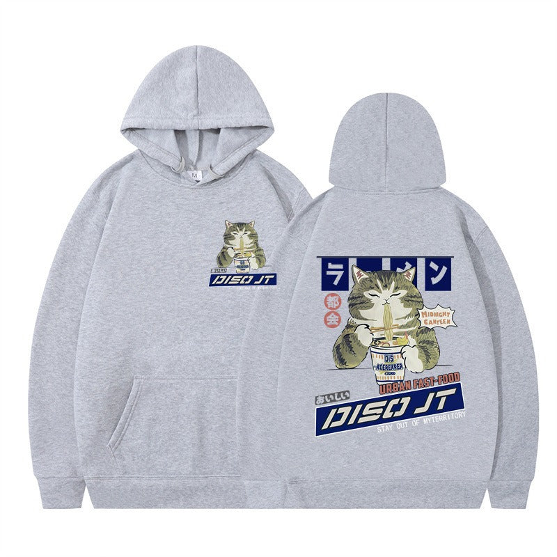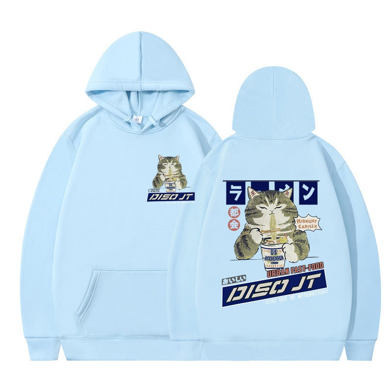 Stay warm and stylish with this Cat Eating Noodles anime hoodie, perfect for fans of cozy streetwear and quirky designs. Featuring a cute cat slurping ramen graphic, this pullover brings a fun twist to your autumn and winter outfits.