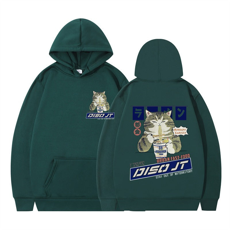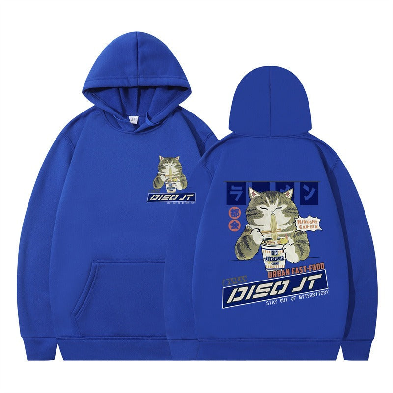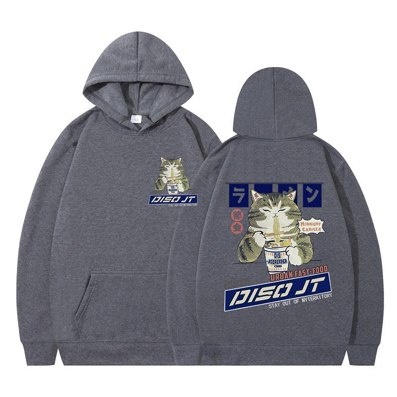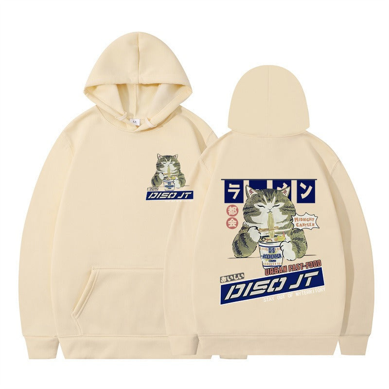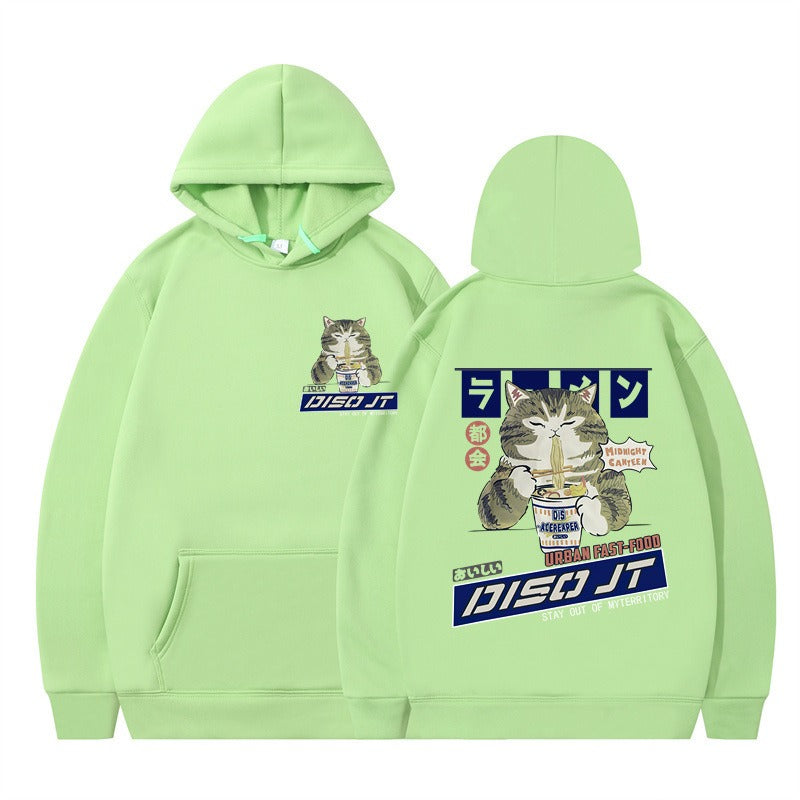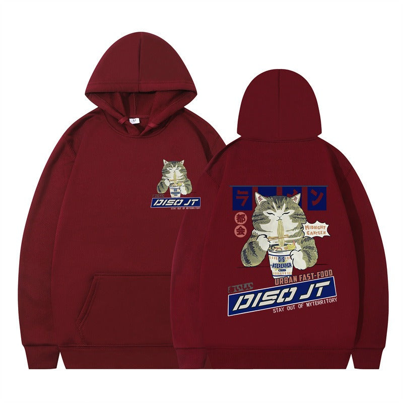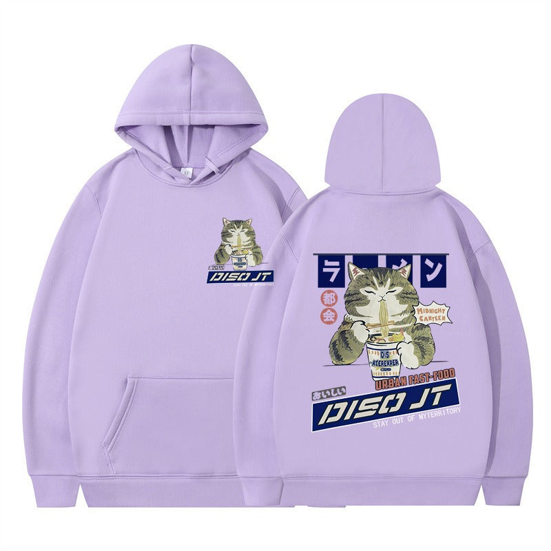 Stay warm and stylish with this Cat Eating Noodles anime hoodie, perfect for fans of cozy streetwear and quirky designs. Featuring a cute cat slurping ramen graphic, this pullover brings a fun twist to your autumn and winter outfits.